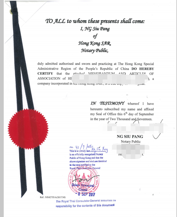 認證流程:香港國際律師公證→高院加簽(海牙認證)→泰國駐香港領事館認證