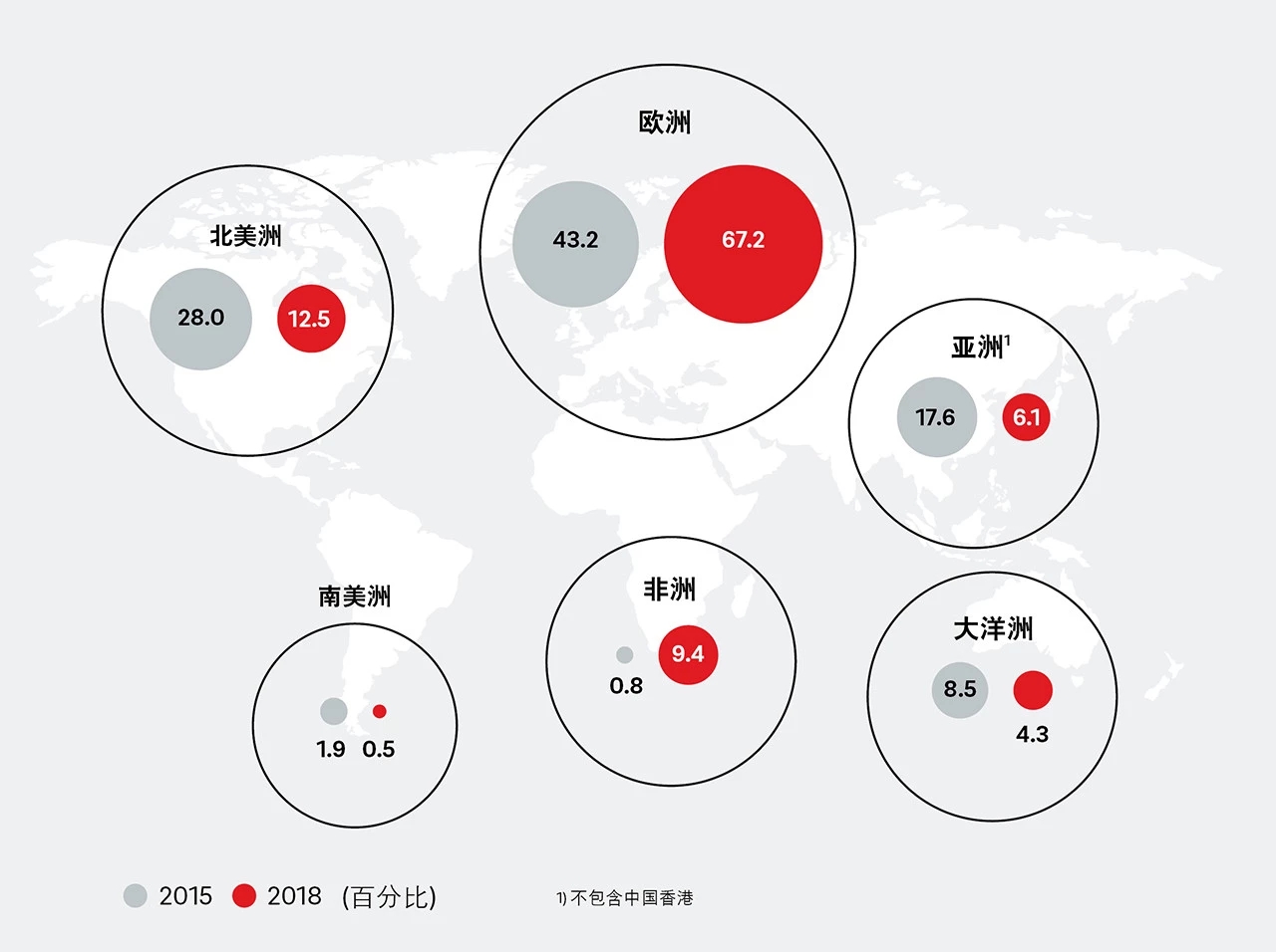 2015年與2018上半年中國(guó)海外并購(gòu)標(biāo)的所屬地區(qū)對(duì)比1)——按交易金額