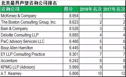 被調查者被要求對調查中的每一家咨詢公司按照威望從1到10的等級進行評分,其中10分是最有聲望的。咨詢師無法評估他們自己的公司,他們被要求只對那些熟悉的公司進行評級。