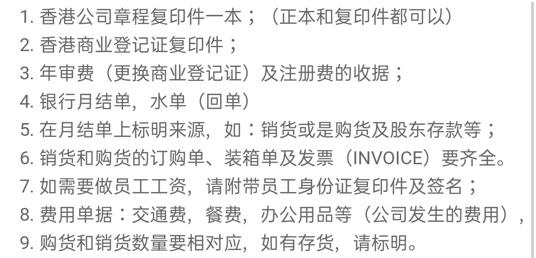 ⑤其它相關文件:章程正本一份、周年申報表、所有公司變更資料(若有)、固定資產票據、投資相關文件、做帳次年度的頭3~5筆購銷發票及相應的收付款單據等。