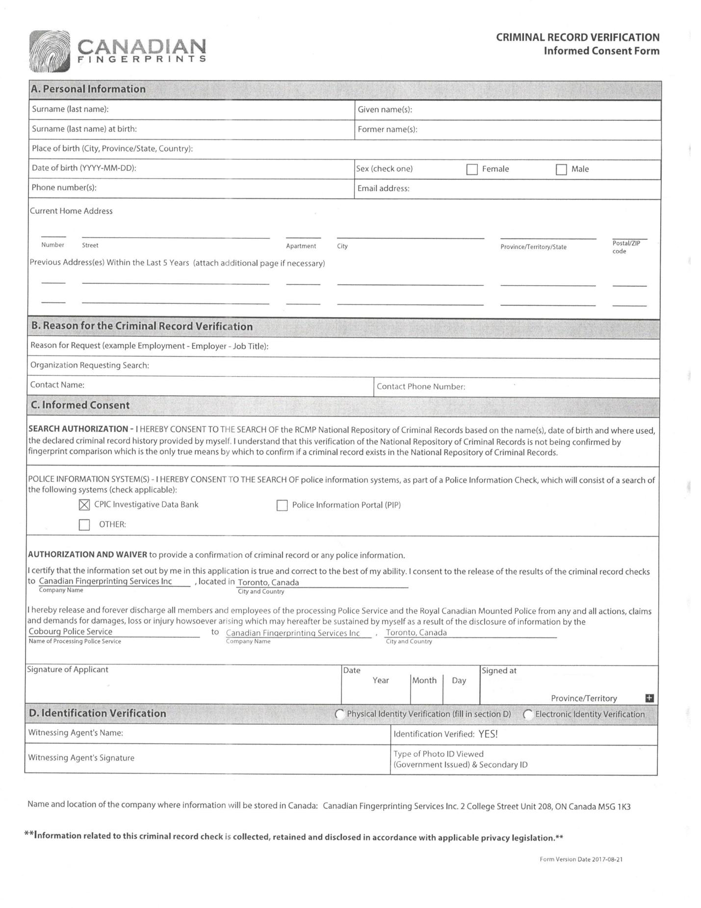 2、填寫以下Criminal Record Verification Form-申請表。填寫好之后并且簽字。