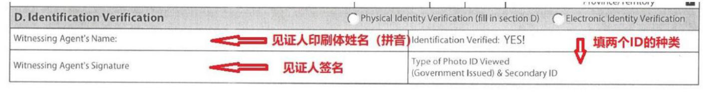 3、表格的D項-(Identification Verification )內容,需要見證客戶兩個 ID 的見證人簽名,填表說明如下所示