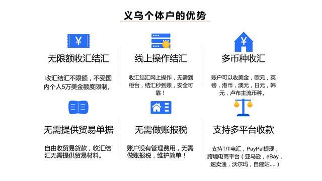 其實早在2014年,國家就頒布了義烏個體戶的政策,義烏個體戶賬戶可享受每年1000萬美金的超大額結匯?;旧鲜堑扔跓o限額結匯,并且義烏個體戶也可綁定paypal直接進行提現,結匯出來就可以。這對于外貿人以及跨境電商從業者來說肯定最實用的!