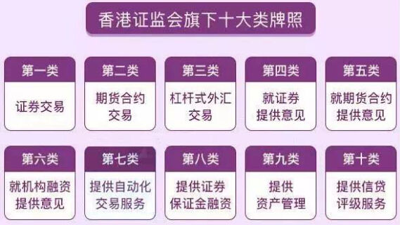 ??? ?首先為大家介紹一下香港金融牌照分類:在香港,證監會管理著10類牌照,每一類牌照對應一塊業務。要從事相應的業務,就必須獲得對應的牌照。