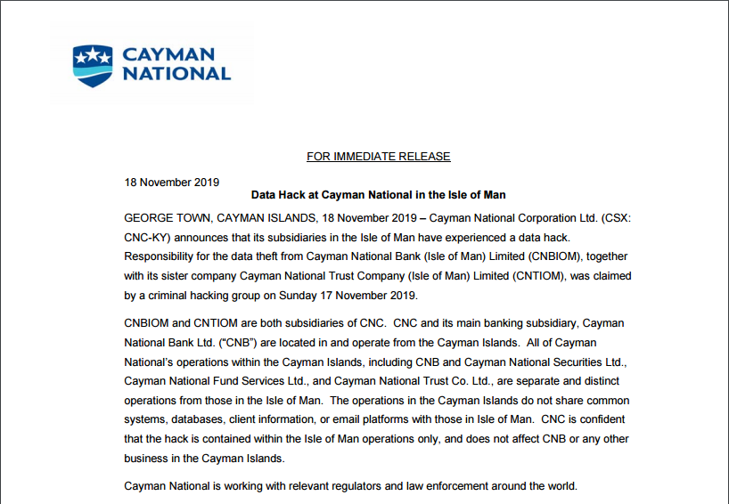 針對此次數據嚴重泄露事件,11月18日,開曼國家銀行公開發布一份聲明,證實其數據信息遭到入侵: