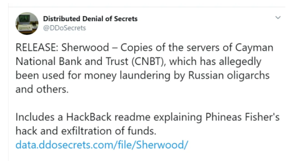 事件還要回到上周五(11月15日),一自稱PhineasFisher的黑客或黑客組織公開發表了一份宣言。宣言稱,他們已經入侵了開曼國家銀行(Cayman National Bank)竊取了數十萬美元,并高調地表示在數字時代搶劫銀行是一種非暴力、低風險、高回報的行動。隨后,該黑客還通過網站 Distributed Denial of Secrets(以下簡稱“DDoS”) 公開了從開曼國家銀行竊取到的 2.21 TB數據。