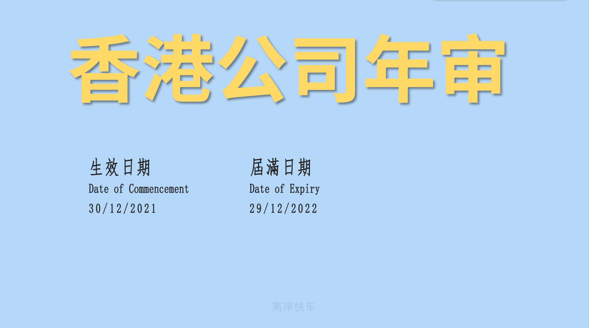 二是,香港公司註冊日往後延期一年就是下一個年度的屆滿日期,屆滿日期到了就可以開始進行年審。屆滿日起42天內遞交週年申報表不產生罰款,一個月內遞交續期商業登記證不產生罰款。