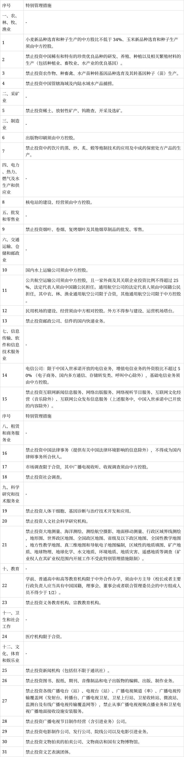經國務院有關主管部門審核并報國務院批準,特定外商投資可以不適用《外商投資準入負面清單》中相關領域的規定。六、從事《外商投資準入負面清單》禁止投資領域業務的境內企業到境外發行股份并上市交易的,應當經國家有關主管部門審核同意,境外投資者不得參與企業經營管理,其持股比例參照境外投資者境內證券投資管理有關規定執行。