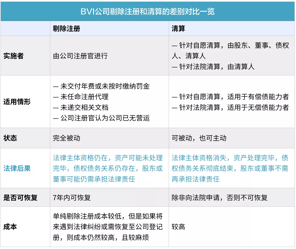 ? 由此可見,在解散一家BVI公司時(shí),需要慎重考慮選擇“剔除注冊(cè)”還是“清算”,二者法律責(zé)任不同,法律風(fēng)險(xiǎn)更是迥異。相對(duì)而言,剔除注冊(cè)的法律風(fēng)險(xiǎn)更高。