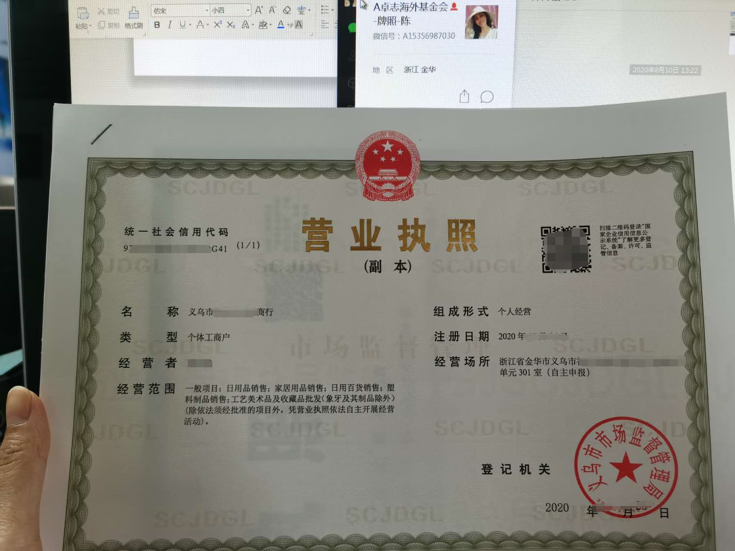3)個體戶名稱:由工商局預先核準通知書,隨機核名取名,如義烏市XX商行/義烏市XX電子商務商行