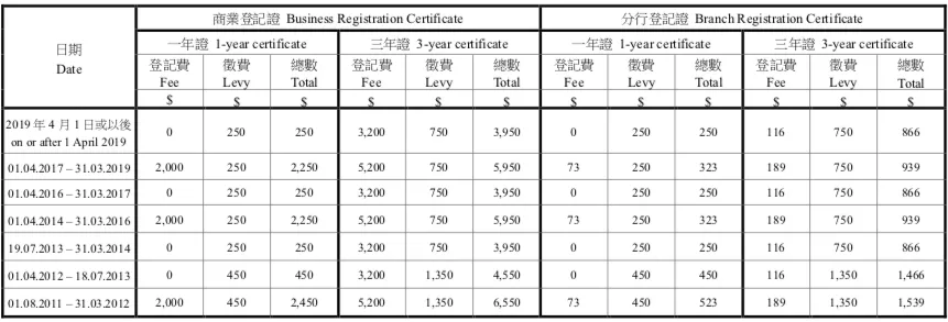 不同年份生效的商業(yè)登記證,所需繳付的商業(yè)登記費不同,詳情如下表: