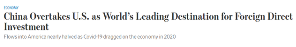 1月24日,美國《華爾街日報》和消費者新聞與商業頻道(CBNC)均作了相關報道。其中,《華爾街日報》報道稱,2020年中國吸收的外國直接投資(FDI)逆勢上漲,超過美國成為全球最大的外資流入國。