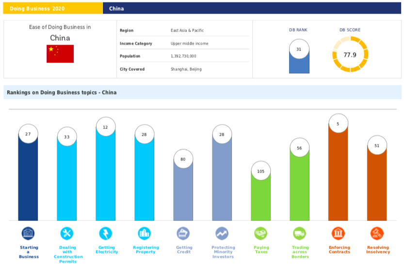正因為如此,中國在世界銀行發布的《2020全球營商環境報告》中從上一年的第47位上升至第31位,其中開辦企業(Starting a Business)項,則名列第27位,營商環境大大改善,營商便利有所增加。