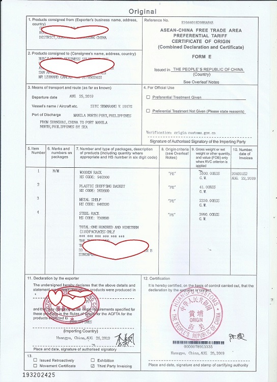 中國東盟自由貿易區優惠原產地證明書,簡稱《FORM E 證書》或《東盟證書》,英文名稱為《ASEAN-CHINA FREE TRADE AREA PREFERENTIAL TARIFF CERTIFICATE OF ORIGINFORM E》。FORM E 證書的簽發,限于已公布的《貨物貿易協定》項下給予關稅優惠的產品,這些產品必須符合《中國——東盟自由貿易區原產地規則》。證書內容以英文填寫。