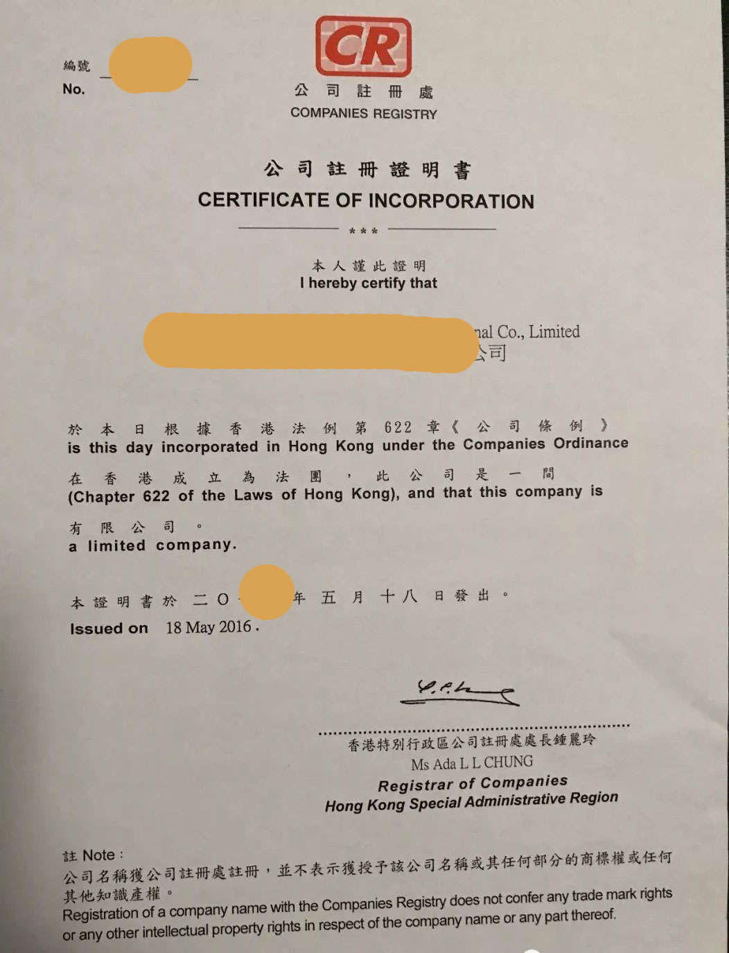 通常成立香港公司后所得到的全套資料如下: 1、商業登記證(BUSINESS REGISTRATION CERTIFICATE) 2、注冊證書(CERTIFICATE OF INCORPRATION) 3、法團成立表格NNC1 4、一套章程 5、鋼印一枚、條形答