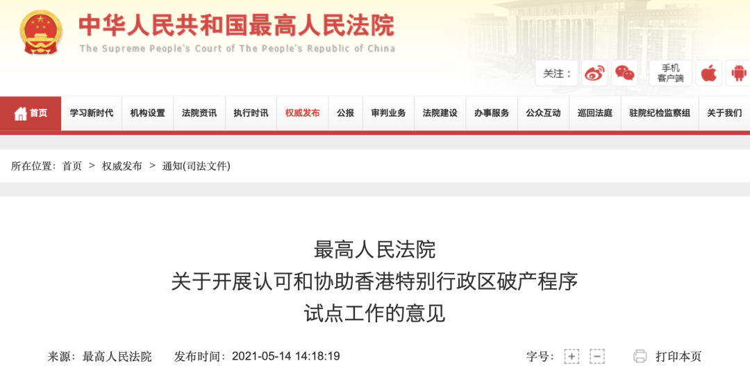 - 最高人民法院指定試點地區內的中級人民法院可與香港特區高等法院開展相互認可和協助破產程序的合作;