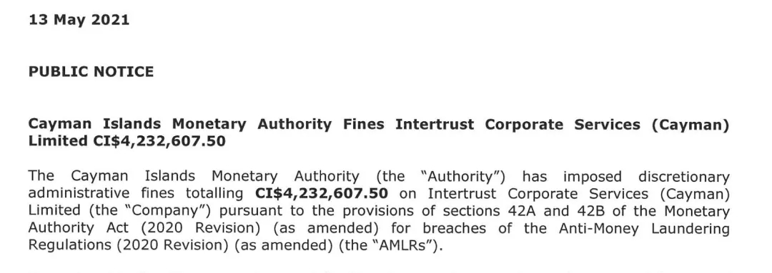 2021年5月13日,開曼群島金融管理局(CIMA)向開曼群島注冊代理人Intertrust Corporate Services (Cayman) Limited(簡稱“Intertrust”)發出了金額為4,232,607.50開曼元(約32,802,407.20人民幣)的行政罰款。