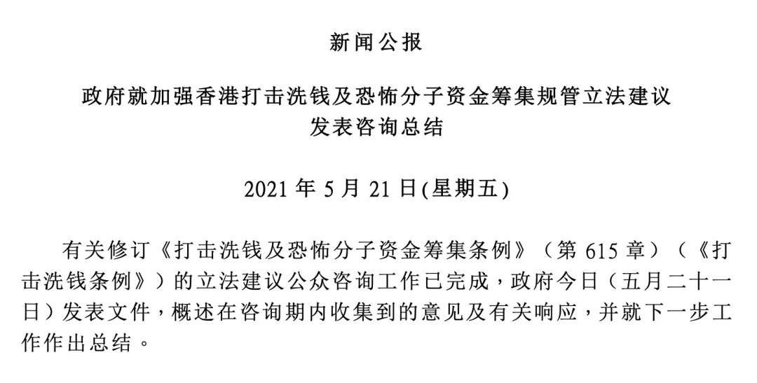 - 2021年5月21日,香港特別行政區政府就加強香港打擊洗錢及恐怖分子資金籌集規管立法建議發表咨詢總結。