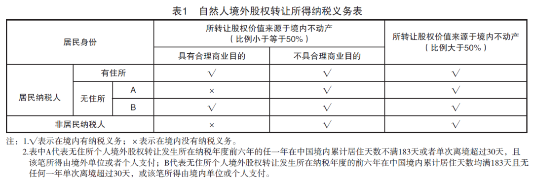 作為非居民,其僅就來源于中國境內的所得申報繳納個人所得稅。境外股權轉讓所得在大多數情況下被認定為來源中國境外的所得,在中國免予繳納個人所得稅,但有兩種情況除外:一是根據3號公告第一條第七款的規定,境外被轉讓股權公允價值50%以上直接或間接來自于位于中國的不動產,符合此條件的境外股權轉讓所得將被直接認定為來源于中國境內的所得,應向中國稅務機關申報繳納個人所得稅;二是通過不具有合理商業目的安排獲取不當稅收利益,被中國稅收機關進行納稅調整。如《中華人民共和國政府和新加坡共和國政府關于對所得避免雙重征稅和防止偷漏稅的協定》在第十三條第五款中約定,一方居民轉讓締約國另一方居民公司股權行為發生前十二個月內曾直接或間接參與該公司至少25%資本,可在該締約國另一方征稅。雖該轉讓行為一般是指非居民納稅人直接轉讓中國公司股權,但如果其通過不具有合理商業目的的安排間接轉讓中國公司股權,則中國稅務機關有權啟動反避稅調查程序,進行反避稅調查。經歸納,自然人境外股權轉讓所得納稅義務詳見表1。