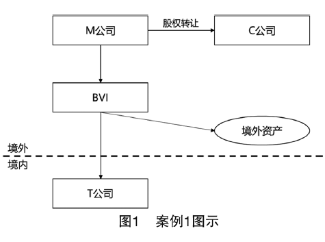- 案例1(見圖1):M公司(境外公司)持有BVI公司(境外公司)100%的股權,BVI公司持有T公司(境內公司)100%的股權,同時BVI公司還持有其他境外資產。M公司將其持有的BVI公司100%的股權轉讓給C公司(境外公司),從而間接轉讓T公司(境內公司)的股權。