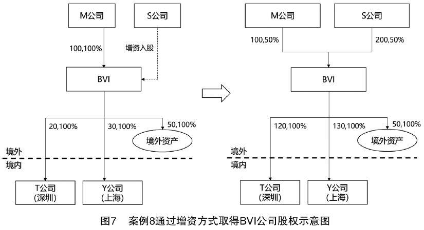 案例8(見圖7):假設M公司初始投資100萬元設立BVI公司,BVI公司用其中50萬元投資境外資產,20萬元投資成立境內深圳公司T,30萬元投資成立境內上海公司Y。2年后,境外資產和境內T公司、Y公司都增值了1倍。因此,BVI公司的公允價值從100萬元變為了200萬元。此時,S公司希望取得BVI公司50%的股權,直接向BVI公司增資200萬元,取得了BVI公司50%的股權。BVI公司取得S公司增值的200萬元后,分別用其中的100萬元增加對深圳T公司投資,100萬元增加對上海Y公司投資。