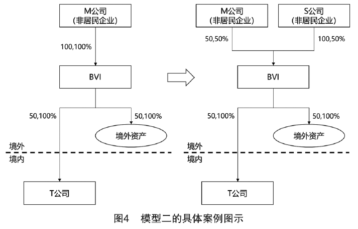 案例5(見圖4):假設原先非居民企業M公司以100萬元投資成立BVI公司,BVI公司用50萬元投資境外資產,50萬元設立境內T公司。之后,境內T公司和境外資產都產生了1倍的增值,BVI公司股權的公允價值從100萬元變為200萬元。此時,M公司轉讓50%的股權給S公司,轉讓價格是100萬元。S公司取得BVI股權的計稅基礎就是100萬元。