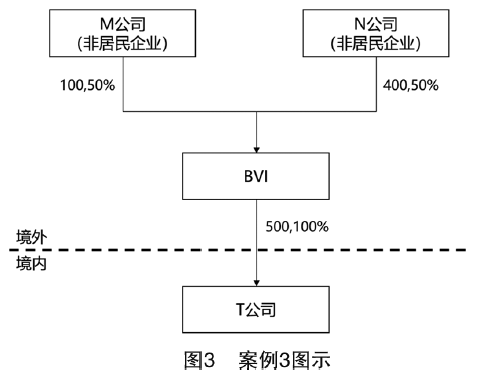 案例3(見圖3):M公司投資100萬元成立BVI公司,BVI公司用100萬元成立境內T公司,之后N公司增資400萬元到BVI公司,占BVI公司50%的股份。而BVI公司用取得的400萬元繼續增加對境內T公司投資。