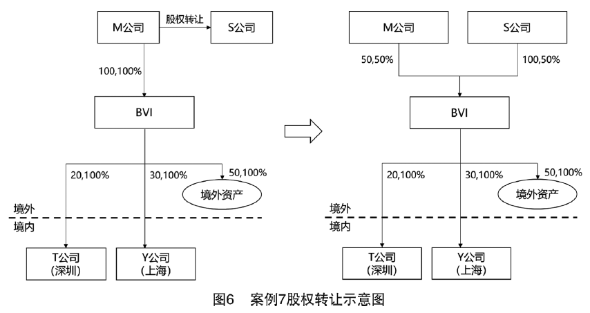 案例7(見圖6):案例基本背景同上,M公司、BVI公司、S公司均為境外公司,T公司(深圳)、Y公司(上海)均為境內公司。