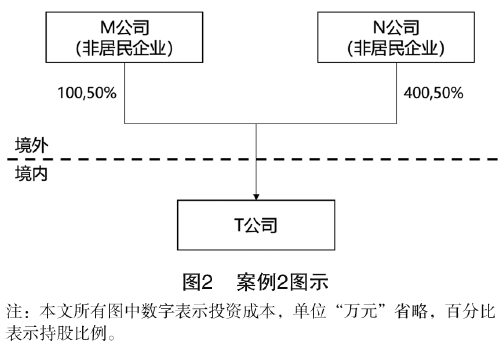 案例2(見圖2):再以一個直接持股的案子為例。假設非居民企業M公司和N公司分別都持有境內T公司50%的股權,M公司是原始股股東,成本假設是100萬元。而N公司是后期增資進來的,成本假設是400萬元。如果這兩家公司此時同時轉讓T公司股權,計算各自的應納稅所得額時,雖然其轉讓收入都是一樣的,但各自扣除的成本是不一樣的,M公司扣除100萬元,N公司扣除400萬元。