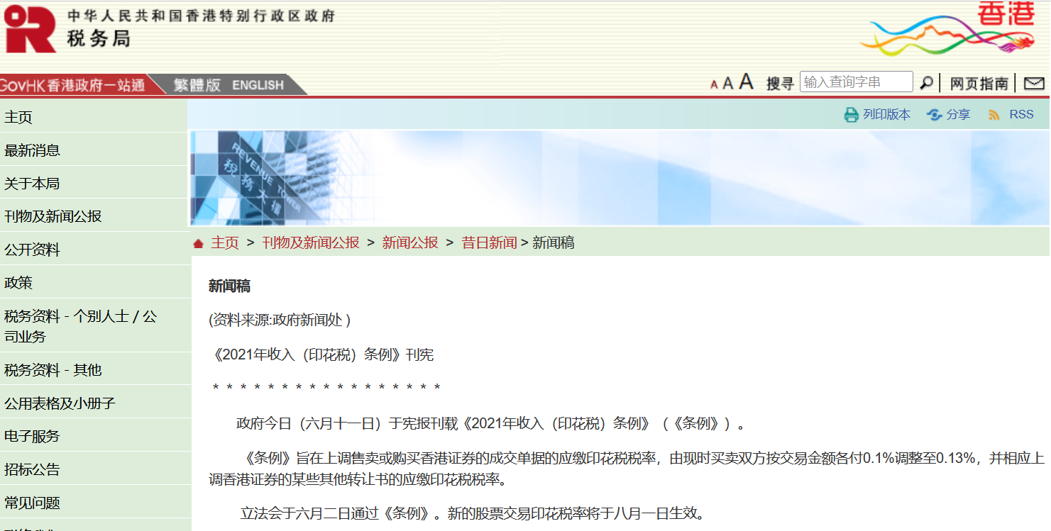 立法會(huì)于六月二日通過《條例》。新的股票交易印花稅率將于八月一日生效。