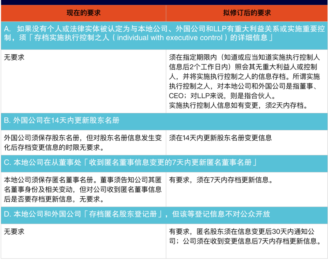 - 如果沒有個人或法律實體被認定為與本地公司、外國公司和LLP有重大利益關系或實施重要控制,則要求本地公司、外國公司和LLP在“控制人登記冊”中「存檔實施執行控制之人(individual with executive control)的詳細信息」;