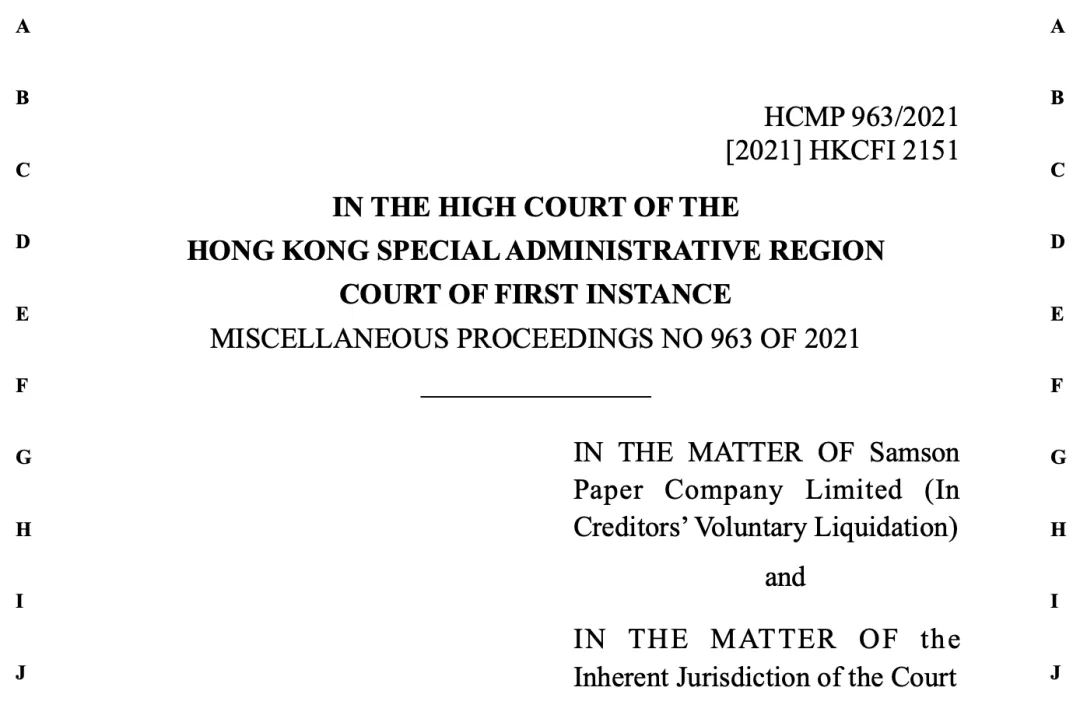 2021年7月20日,香港高等法院做出判決,支持森信紙業有限公司(Samson Paper Company Limited,簡稱“森信紙業”或“公司”)香港清盤人的申請,向深圳市中級人民法院破產法庭(“深圳市破產法庭”)發出請求函,申請對公司清盤人予以認可與協助。