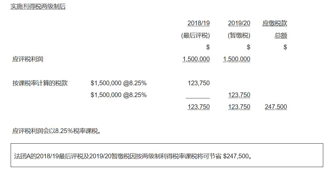 如:香港公司A申報2018/19課稅年度的應評稅利潤為 $1,500,000。由于法團A沒有任何有關連實體,利得稅計算如下: