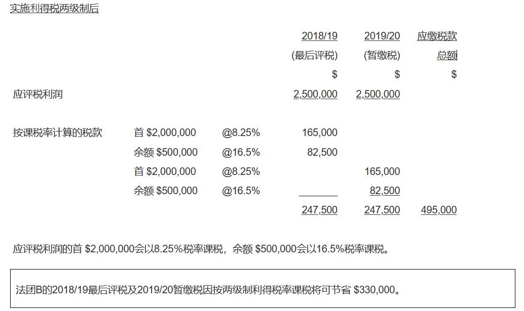 如:香港公司B申報2018/19課稅年度的應評稅利潤為 $2,500,000。由于法團B沒有任何有關連實體,利得稅計算如下:
