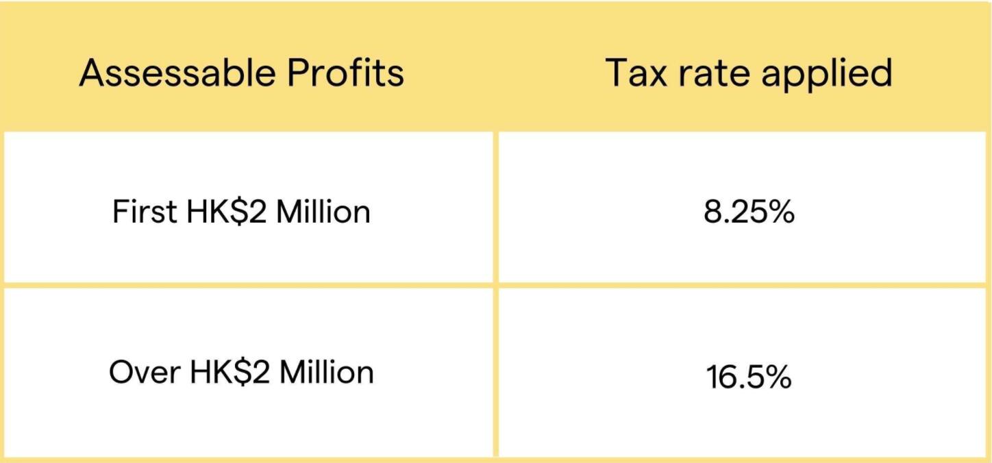自2018年4月1日以及或之后開始的課稅年度起,香港利得稅根據兩級制征收。如果法團營業利潤未達到200萬港幣的,則按照8.25%進行征稅,而超過200萬港幣的,首個200萬港幣仍然以8.25%進行征收,超過的利潤才會以16.5%進行征收。