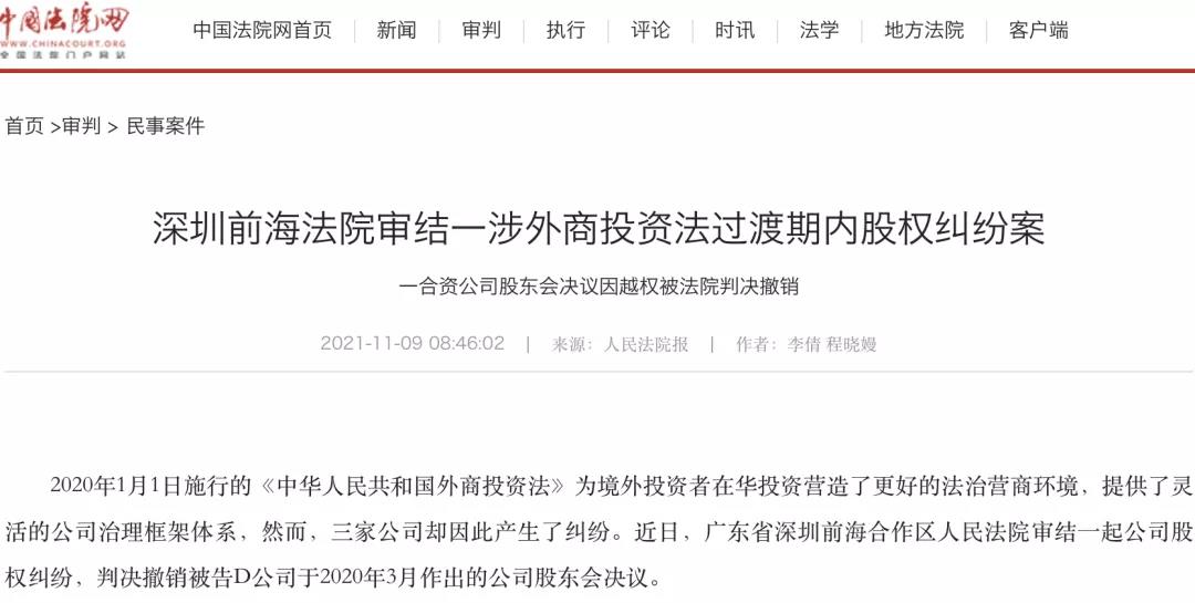 近日,廣東省深圳前海合作區人民法院審結一起中外合資企業的股權糾紛,判決撤銷被告D公司于2020年3月作出的公司股東會決議。由于該案涉及到《外商投資法》下5年過渡期內的公司治理結構調整所面臨的現實問題,因此受到了外商投資企業的高度重視。