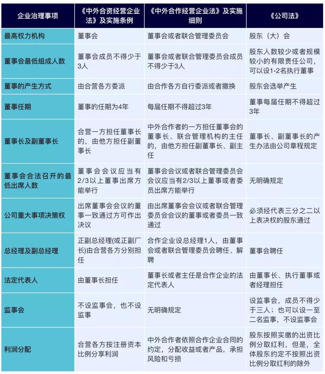 但是,自從2020年1月1日起,全新的《外商投資法》開始施行,并為三資企業留了5年的過渡期。事實上,三資企業法和《外商投資法》及其實施條例,在公司治理結構上存在比較明顯的差別。