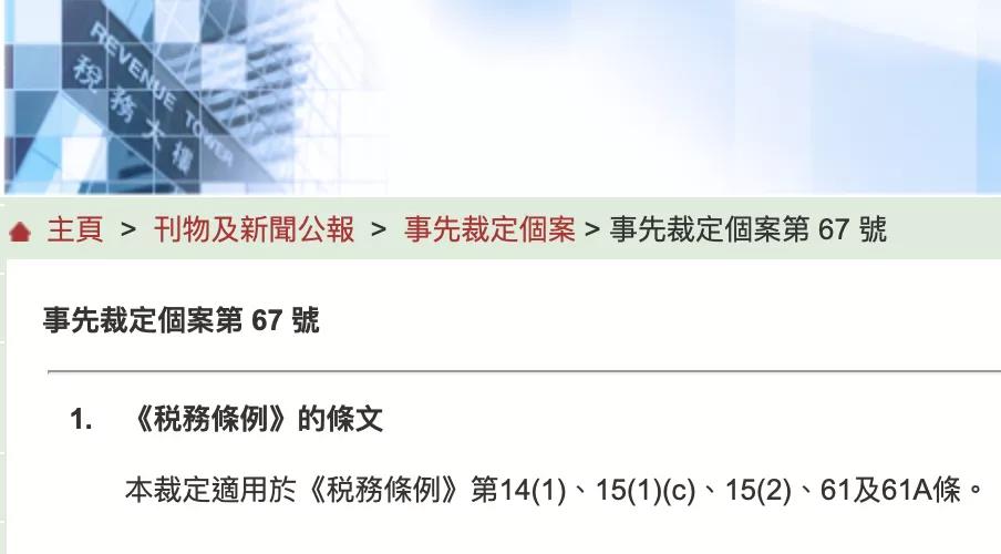 本裁定適用於《稅務(wù)條例》第14(1)、15(1)(c)、15(2)、61及61A條,具體如下:1.《稅務(wù)條例》第 14(1)條規(guī)定,任何人在香港經(jīng)營(yíng)任何行業(yè)、專業(yè)或業(yè)務(wù)而從該行業(yè)、專業(yè)或業(yè)務(wù)獲得于香港產(chǎn)生或得自香港的應(yīng)課稅利潤(rùn)(售賣資本資產(chǎn)所得的利潤(rùn)除外),則須向該人征收利得稅。