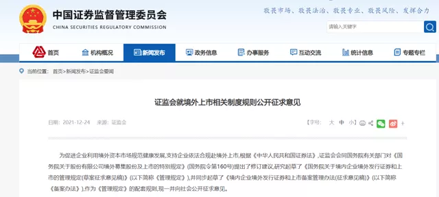 12月24日,中國證監會發布了《國務院關于境內企業境外發行證券和上市的管理規定(草案征求意見稿)》(以下簡稱《管理規定》)和《境內企業境外發行證券和上市備案管理辦法(征求意見稿)》(以下簡稱《備案辦法》)【1】,明確VIE架構企業在合法合規并完成備案的前提下可以申請境外上市。