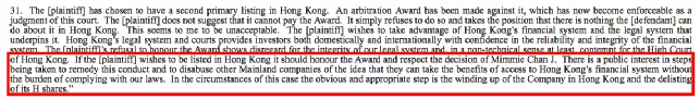夏利士法官在判決書中說,針對晨鳴紙業的行為作出懲罰不僅符合公共利益,而且會打消一些內地企業既想通過香港的金融體系獲利,又不愿遵行香港法律的念頭 。