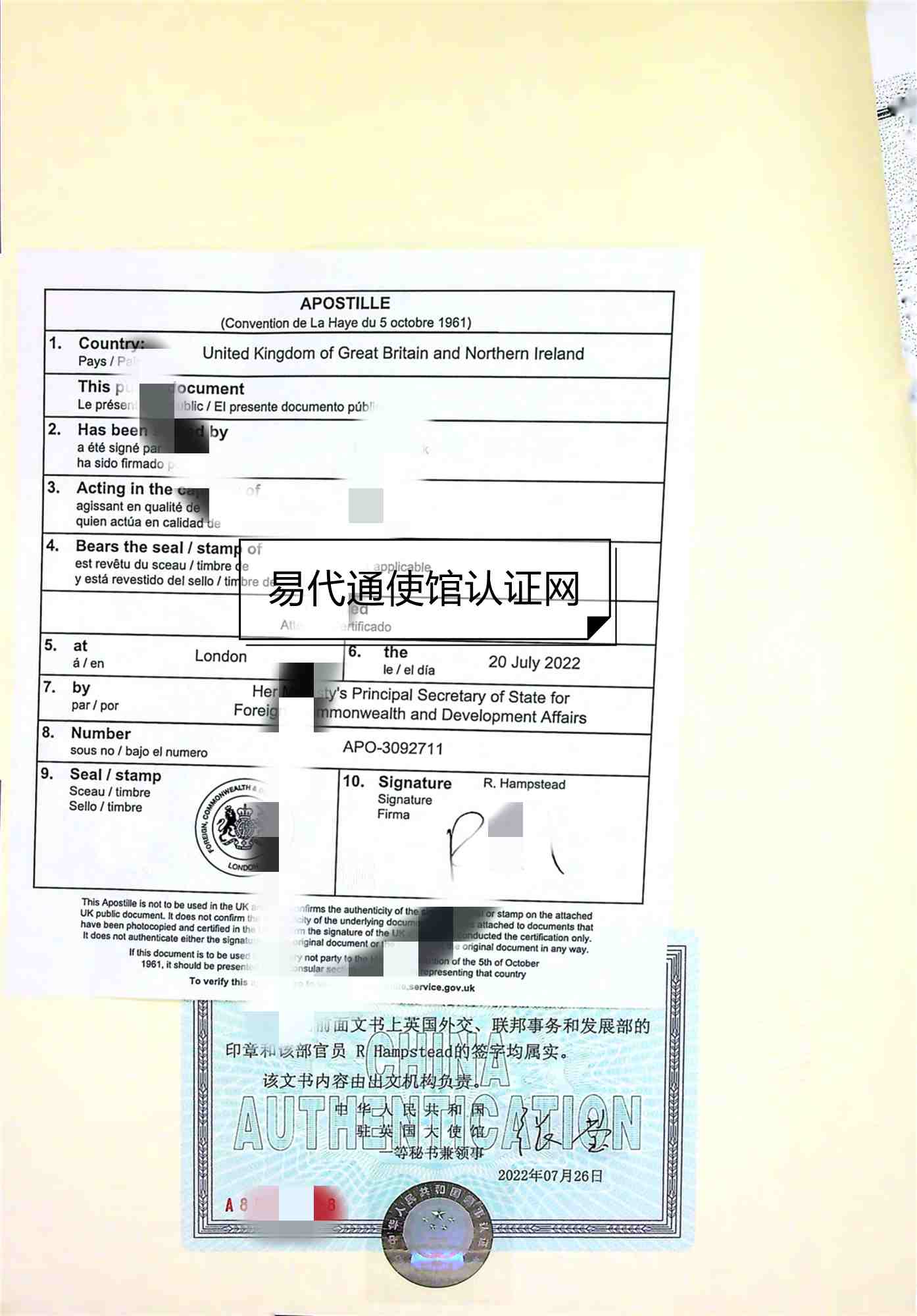 2、再送往英國外交部進行認證